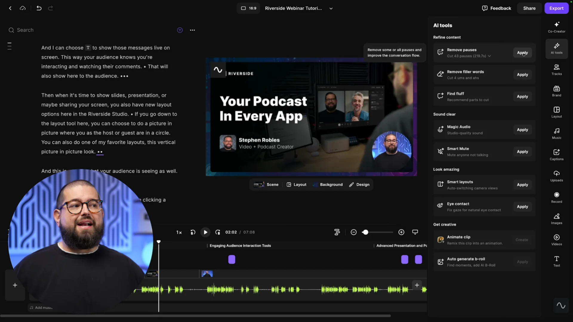 You can still use Co-Creator, the text-based editor, timeline, and audio enhancement tools. Same as with an audio recording, you can remove filler words and silences, clean up background noise, and normalize audio levels automatically.