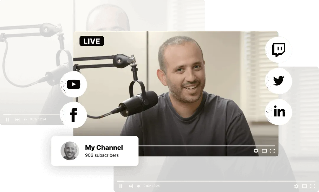 Erhalte das Beste aus beiden Welten. Simulcast auf LinkedIn, Facebook, YouTube, Twitter und Twitch und gleichzeitig Deine Show aufnehmen. Erlaube den Teilnehmern, live mit Video anzurufen, um ein interaktives Element hinzuzufügen.