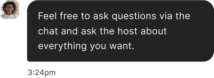 Lass Publikumsteilnehmer Fragen über den Chat stellen oder ruf live mit Video an, damit sie sich mit dem Host und Gast vorübergehend an der Aufnahme teilnehmen können. Ideal für interaktive, AMAs oder Premium-Community-Sitzungen.